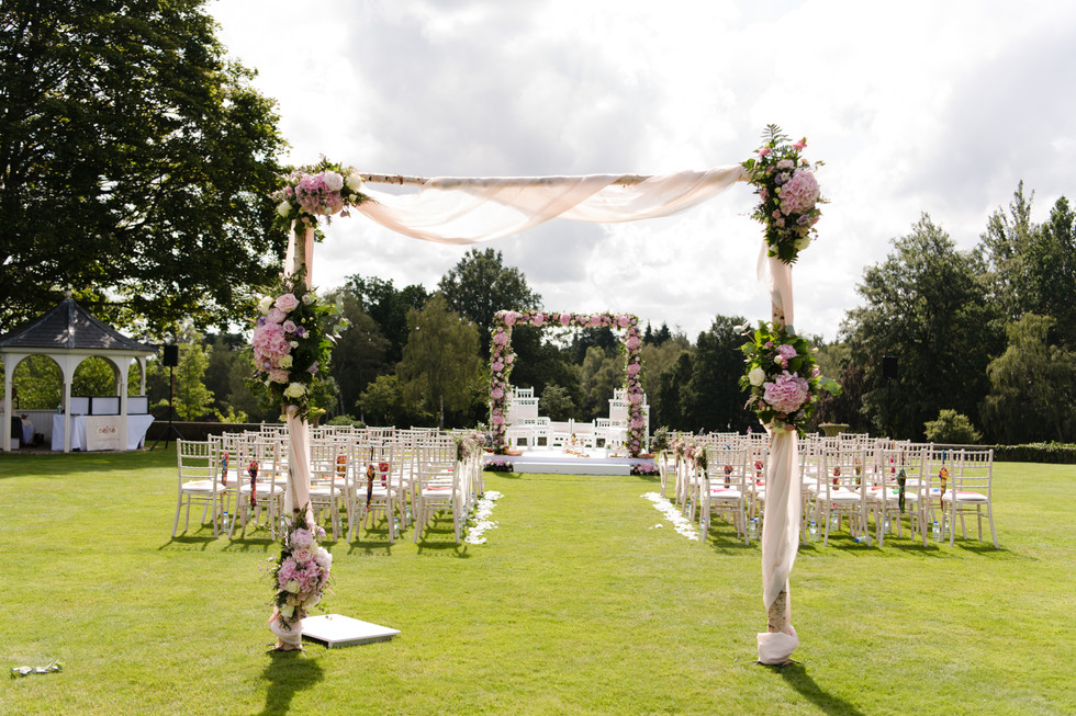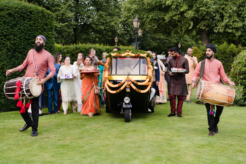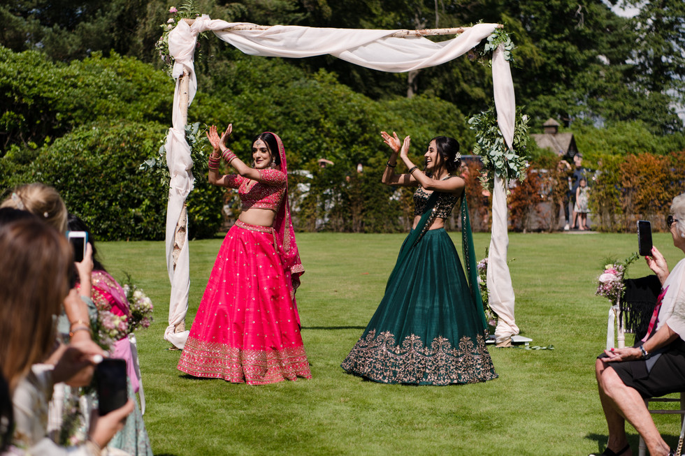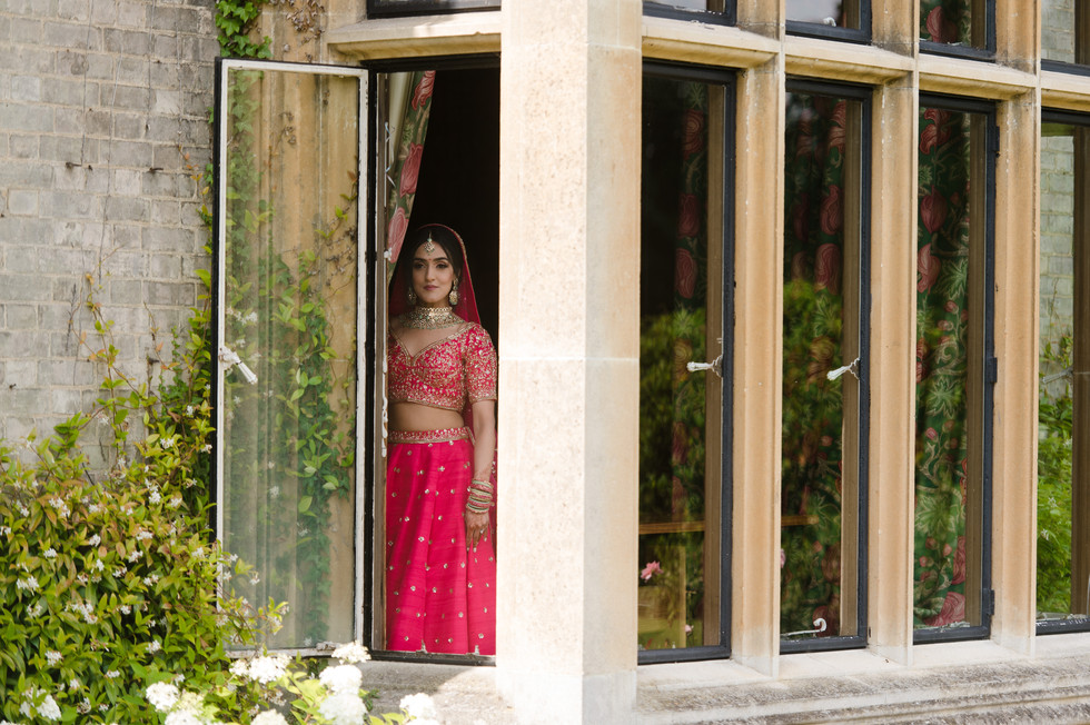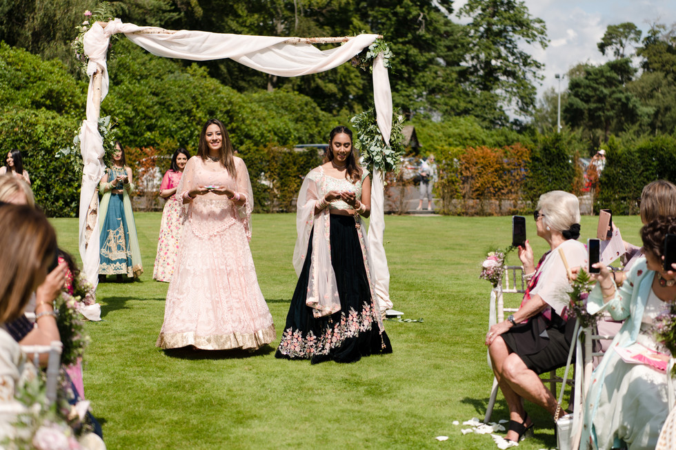 Their two-day affair started with the elegant civil ceremony in the stone-walled orangery, followed by a classic British afternoon tea. The following day the couple walked around the fire in a stunning outdoor Hindu wedding ceremony surrounded by the lush green with the sun beaming down.