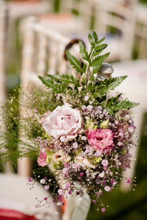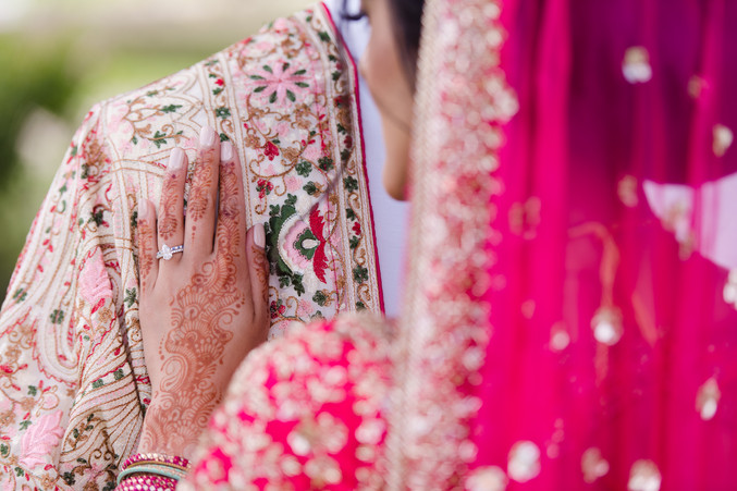 With a summer floral theme of fuschia, soft pink, lilac and greens, the mandap perfectly complimented Manavi’s bright and bold lengha, with Jay adorning a custom-embroided shawl to match.