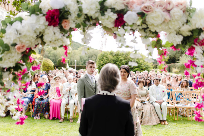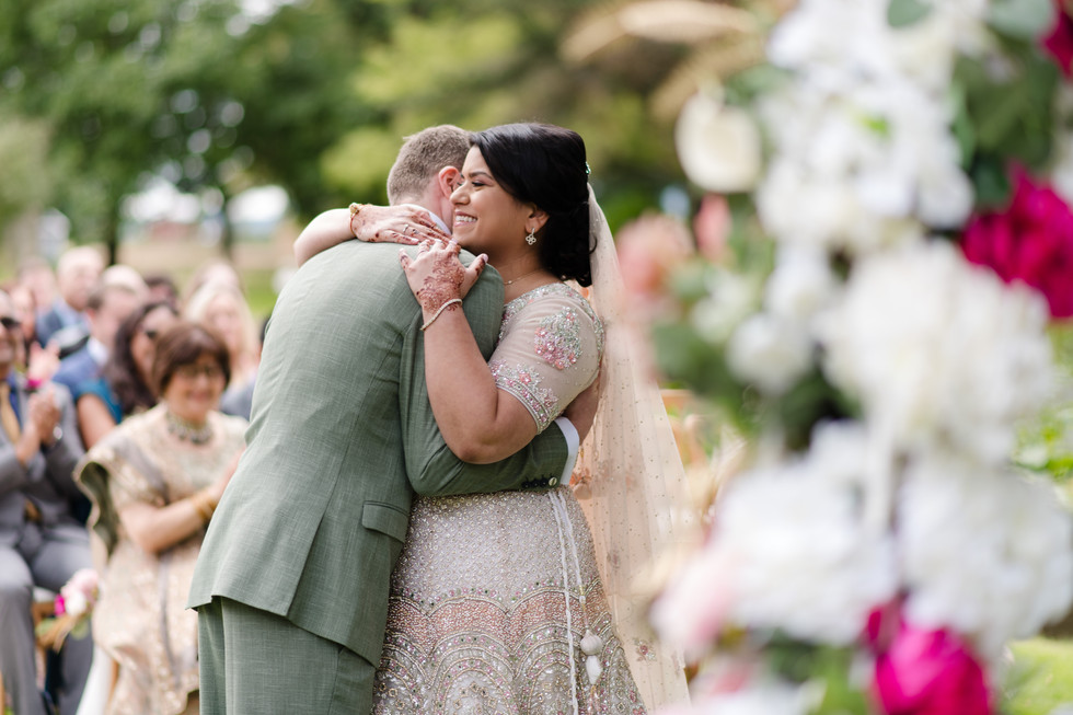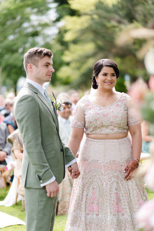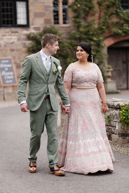 The day began with an intimate civil ceremony in the picturesque outdoor setting of Brinsop Court’s gardens. With the sun casting a soft glow, Anisha and William exchanged vows in front of close family and friends. Anisha looked radiant in a modern, version of her bridal lengha complete with a flowing veil, symbolizing the start of their union in the presence of nature and loved ones. The natural beauty of the surroundings made this an incredibly romantic and peaceful start to their day.