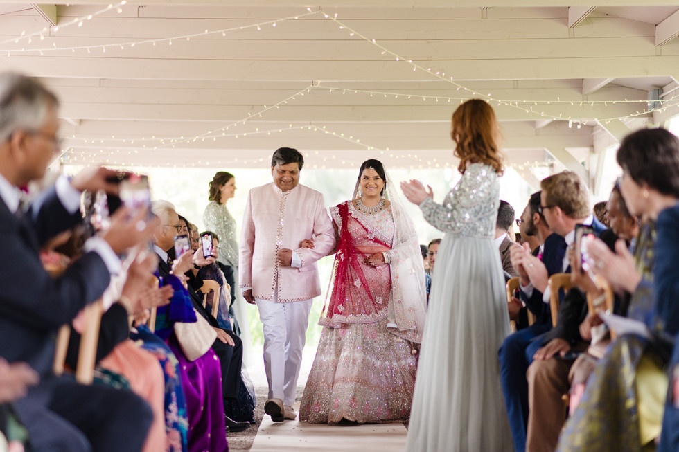 Following the civil ceremony, guests gathered for the vibrant Hindu wedding, held outdoors under a beautifully decorated mandap. The setting was a seamless blend of traditional Indian elements and the natural elegance of Brinsop Court’s grounds. Anisha’s bridal look transformed with the addition of traditional jewelry and a dupatta, honoring her heritage while embracing the fusion of cultures that defined the day. The ceremony, steeped in sacred rituals and blessings, celebrated not just the union of two people but the joining of two families and cultures. William, dressed in a sherwani, fully embraced the traditions, and the couple performed each ritual with heartfelt dedication, creating a perfect blend of English and Hindu customs.